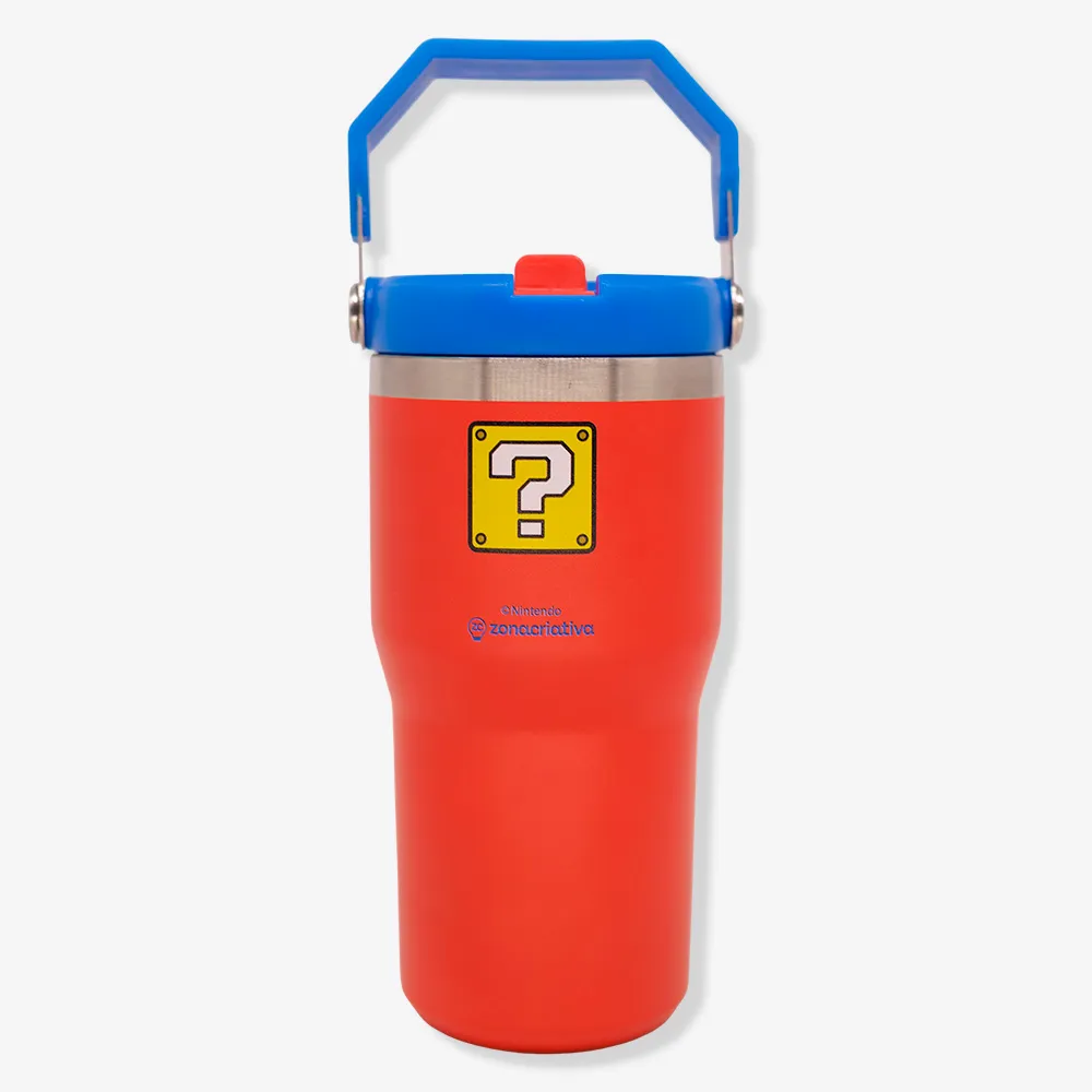 Possui design temático colorido do personagem Super Mario, além de tampa com vedação e canudo reutilizável, que facilitam o uso e ajudam a evitar vazamentos. A alça (hanger) torna o transporte mais prático, permitindo prender em mochilas e bolsas com facilidade.